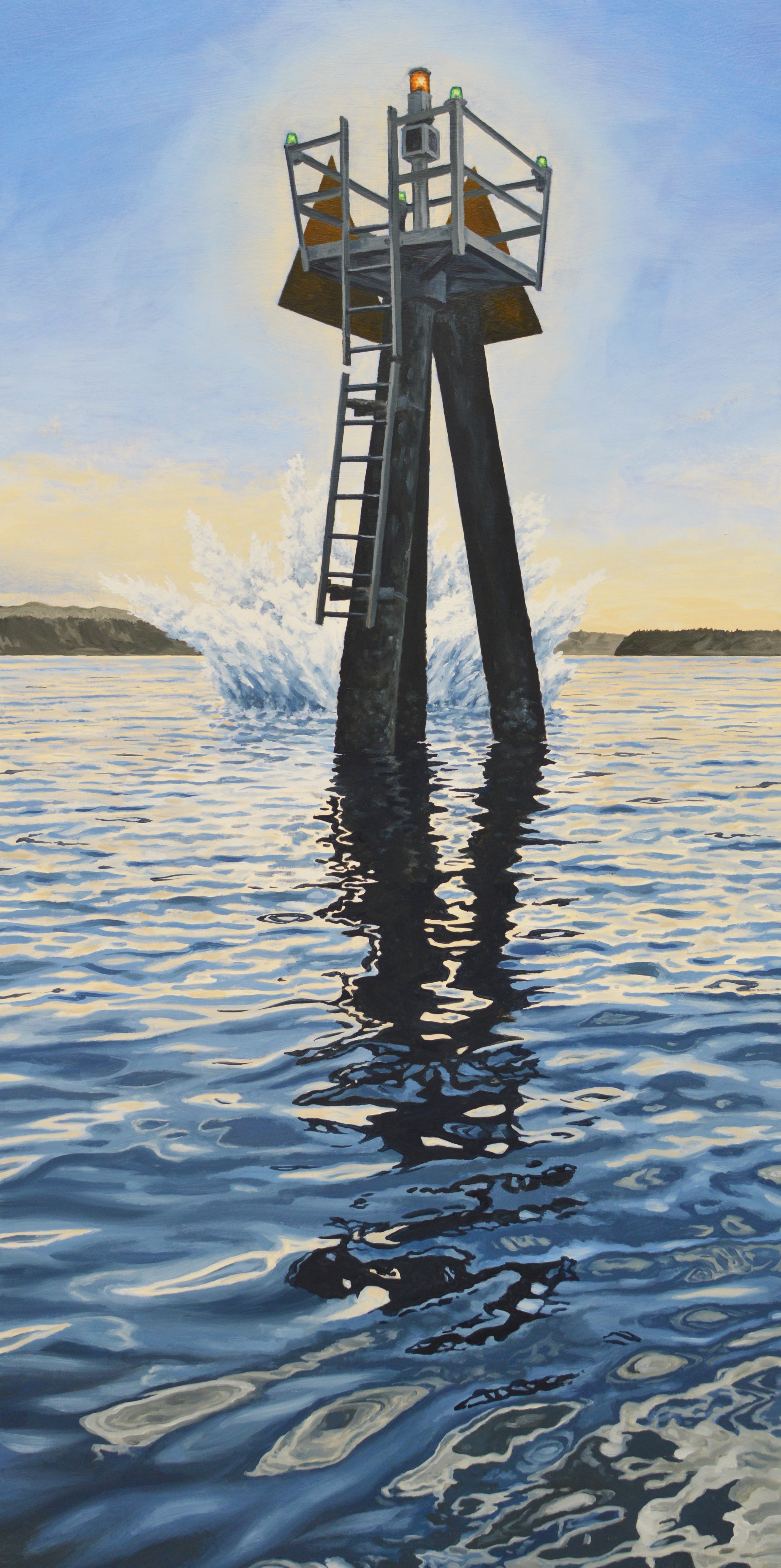 Luminosity is also a hallmark of Mangan’s paintings, which are realistic scenes that are highly unlikely to ever be seen in this world. “Point Marker” pictures a platform standing in water with a huge splash of water behind it (one can’t help but wonder what made the splash) and a broken ladder leading from the water to the top of the platform. “Sending the Barrels” is the one mentioned earlier of wooden whiskey barrels tumbling over a waterfall, and “Treasure for the Taking” is the one with the treasure chest caught up in the roots of a tree. It is believably realistic and natural except for the rays of light shining out of the chest.