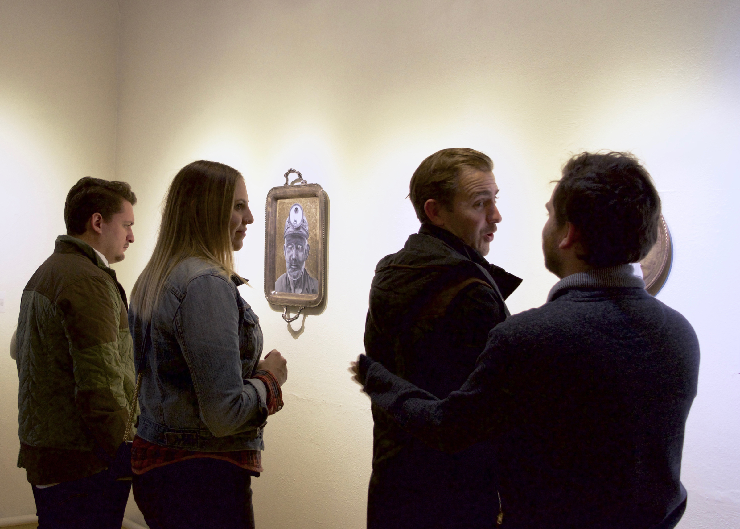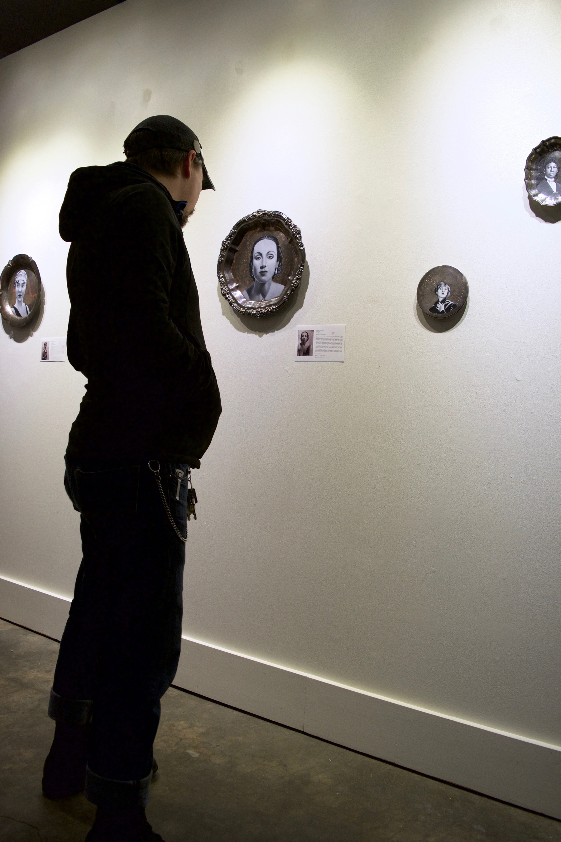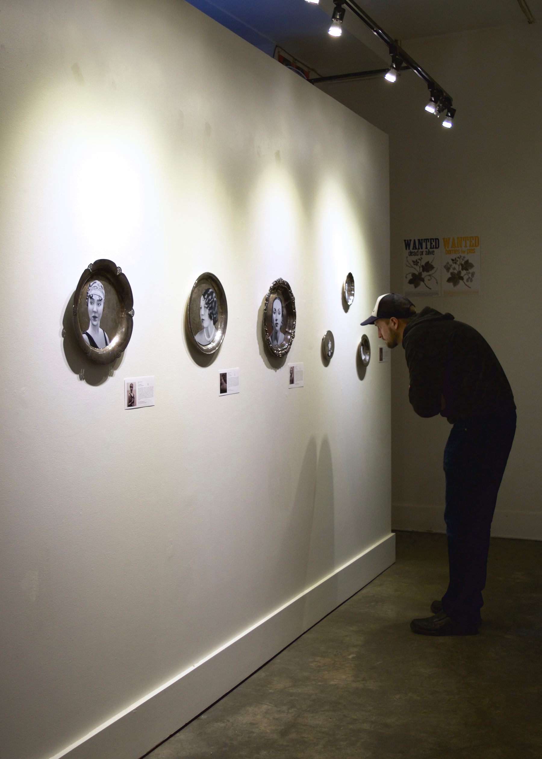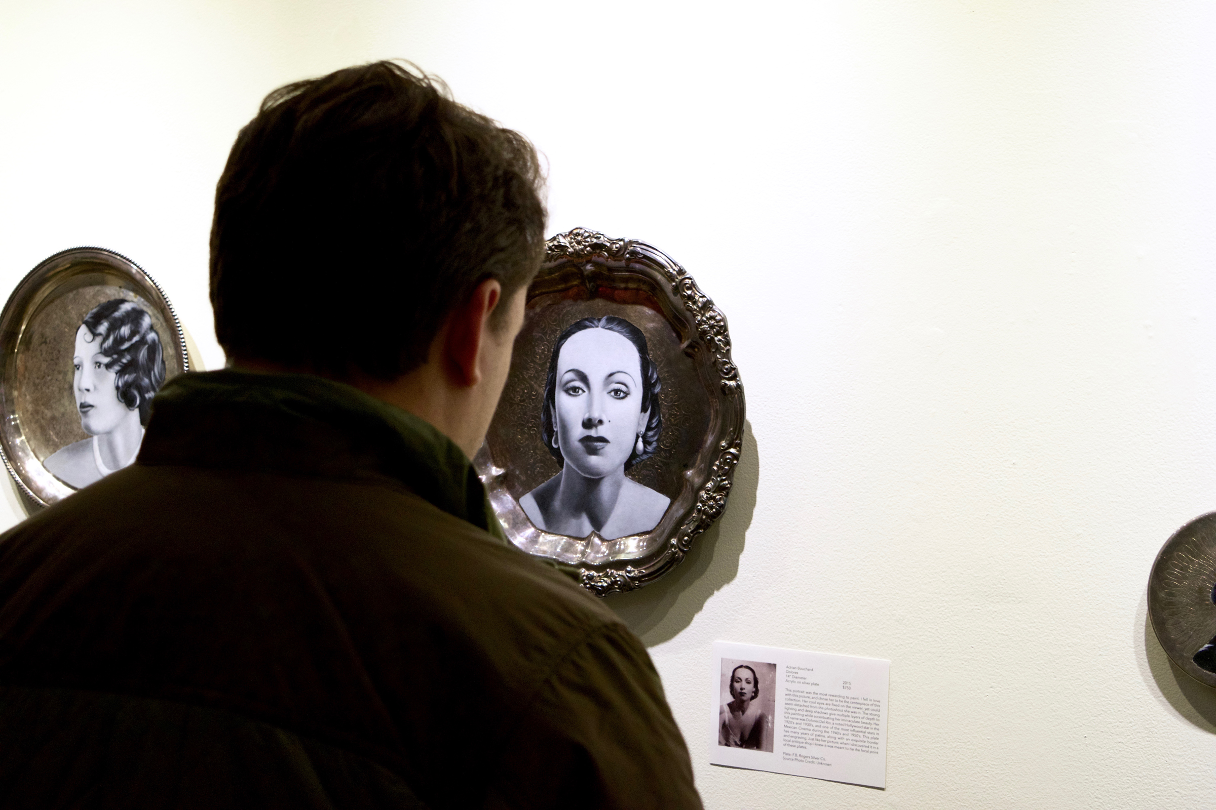 Blue Collar is a unique collection of work sourced from the early part of the last century. Period photographs and antique serving platters are wedded, transforming into bold dimensional portraits. Miners, farmers, child workers, and housewives are presented as haunting reflections of hardship and longing juxtaposed within the opulent filigree of service and wealth. Blue Collar reminds us of who we are and where we have come from. This work is especially poignant for today’s culture as we slide into a similar economic dynamic as The Great Depression.