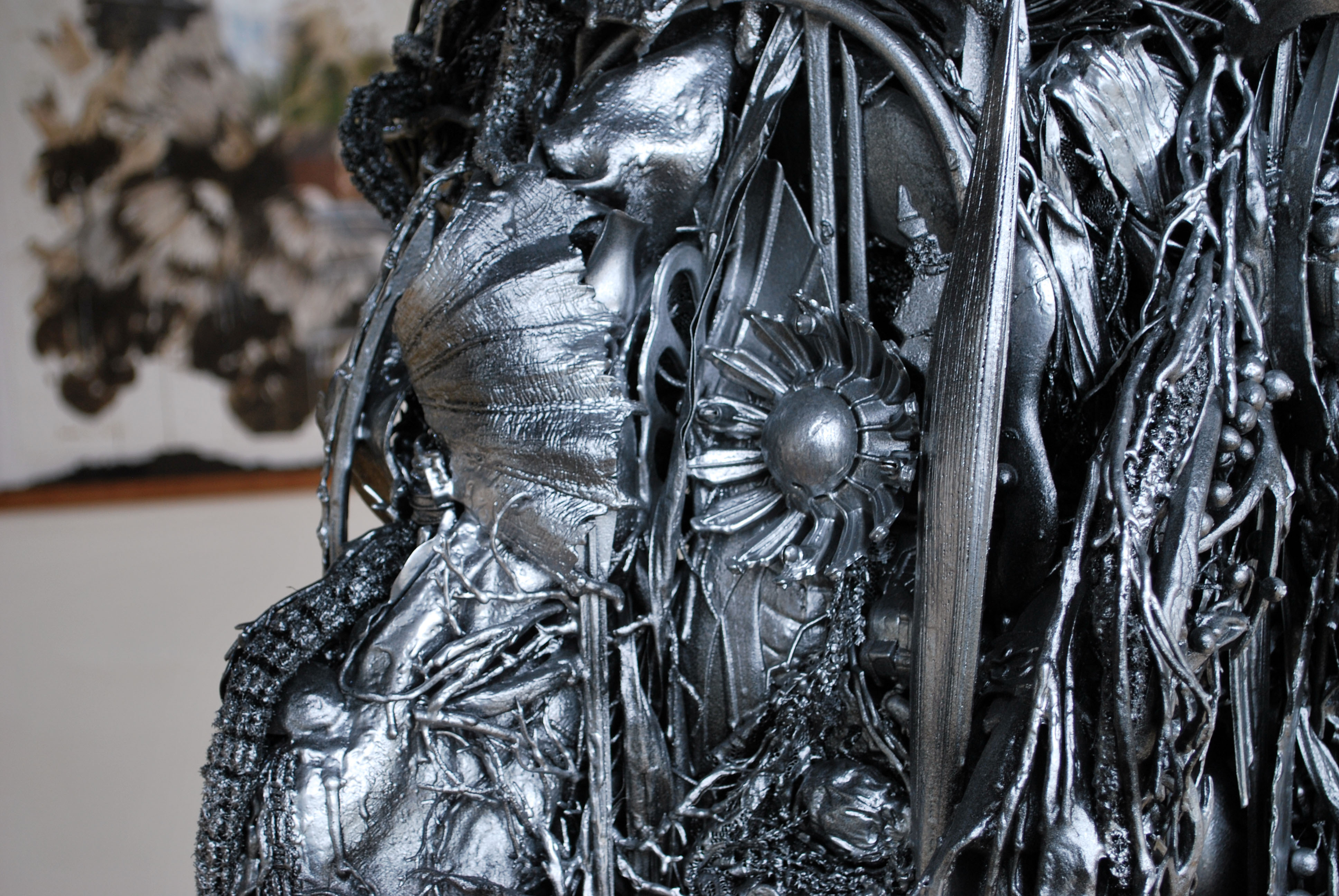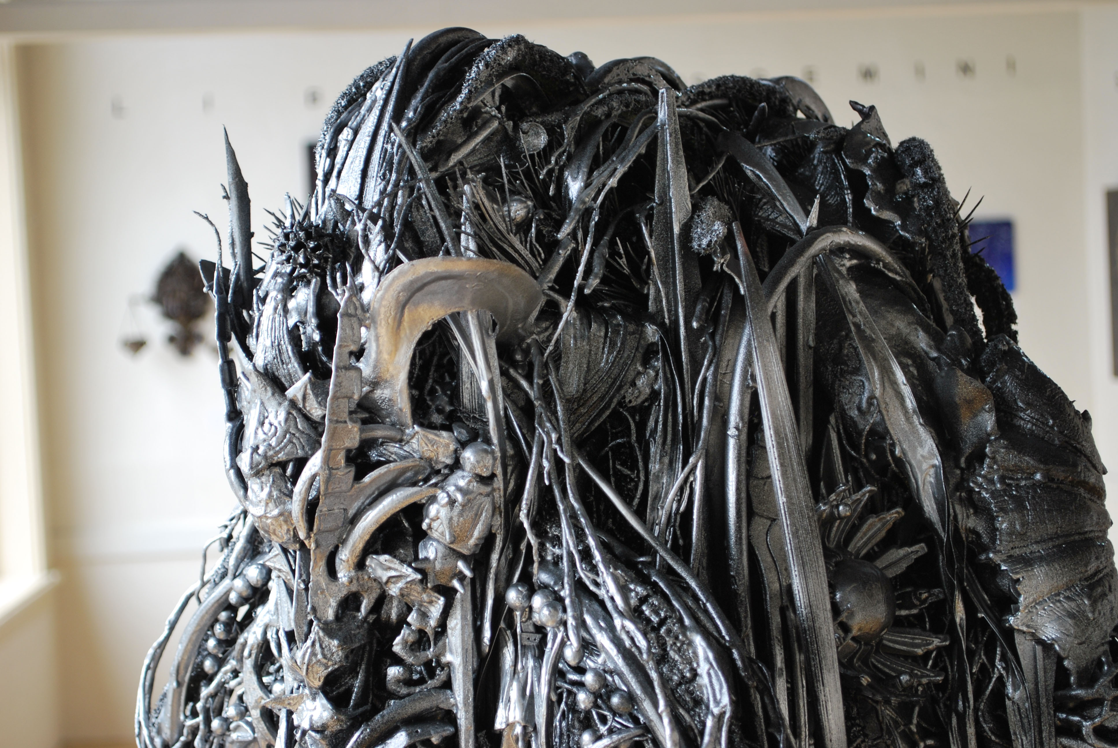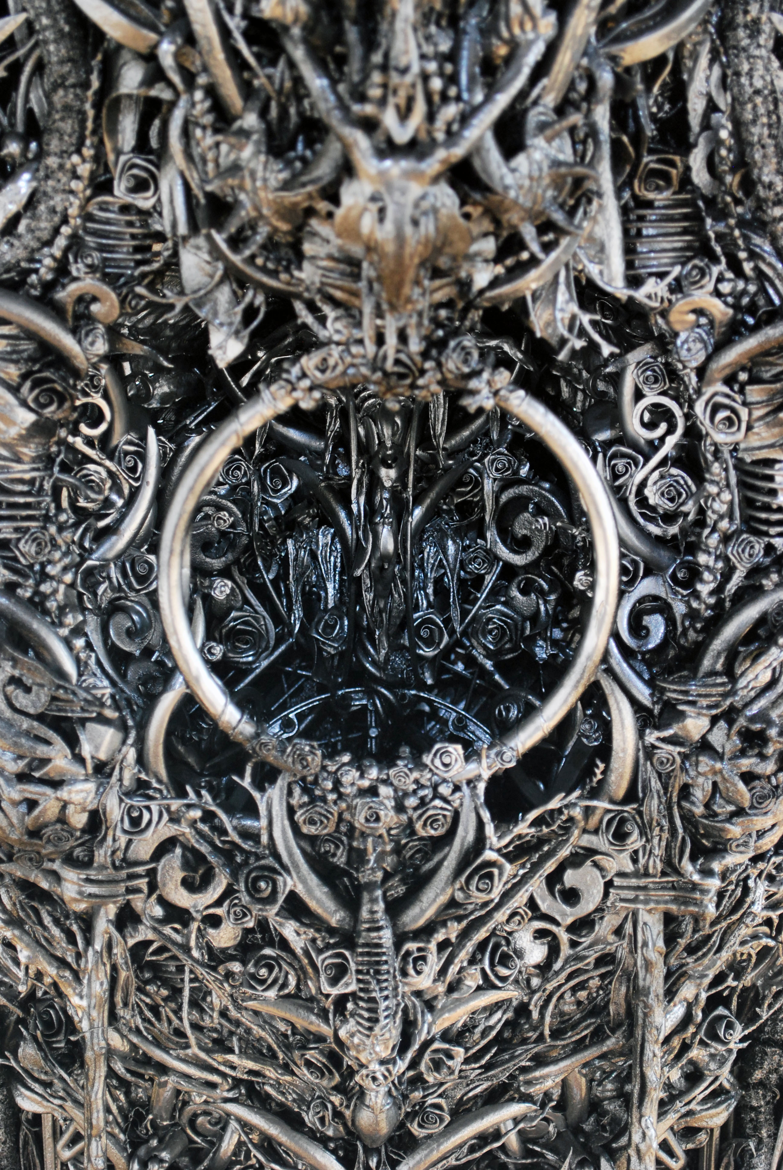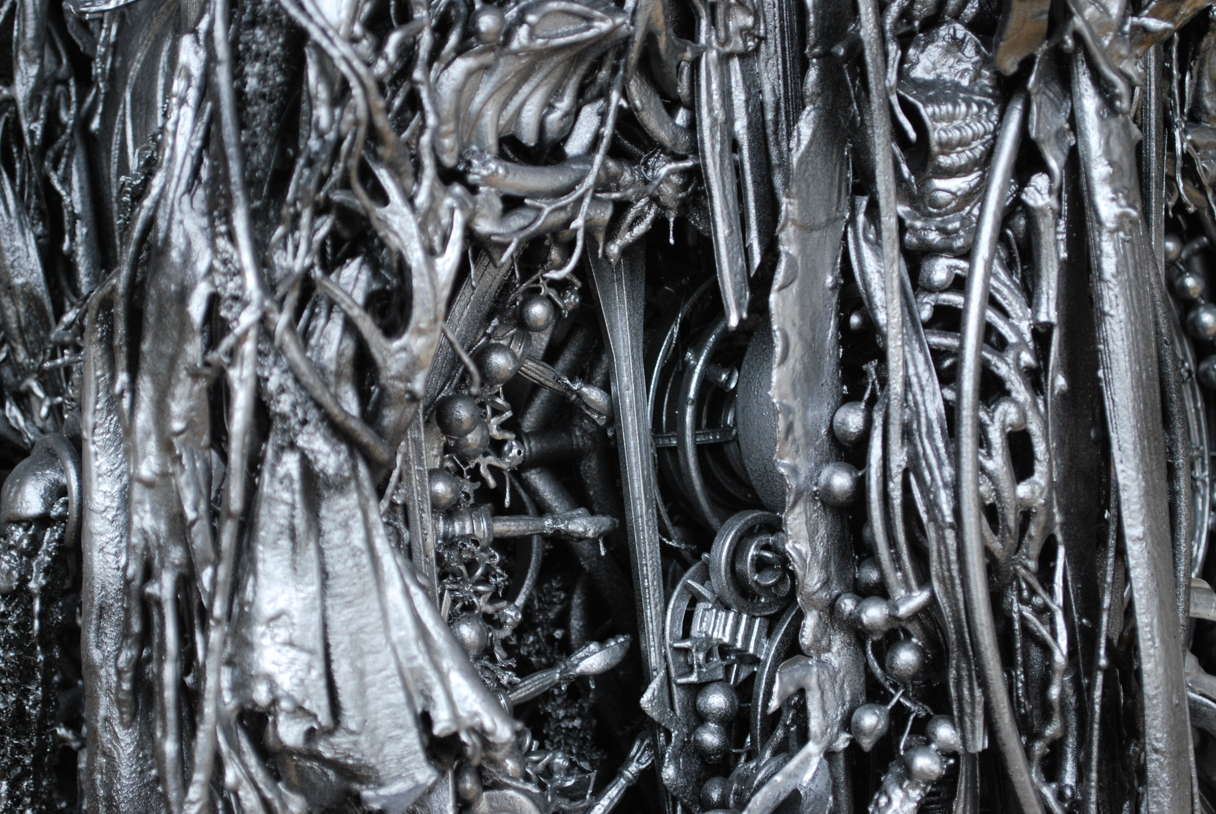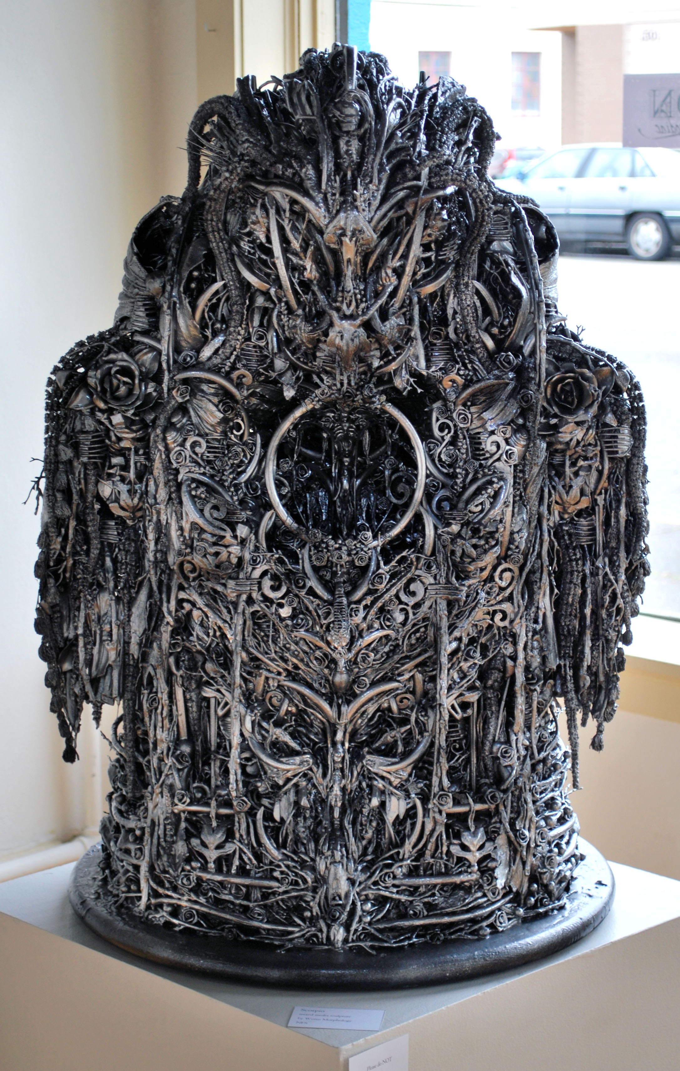 And so it came to pass. This is but a brief excerpt from my interaction with Worm Morphology, and for his creation there are even fewer words. This piece actually unfolds before your eyes. It is a multimedia assemblage of found objects and collected artifacts. As you step closer you will find detail within the details, and even more details within those. In the evenings it seems to flicker with an energetic presence. Maybe it’s haunted. -O
