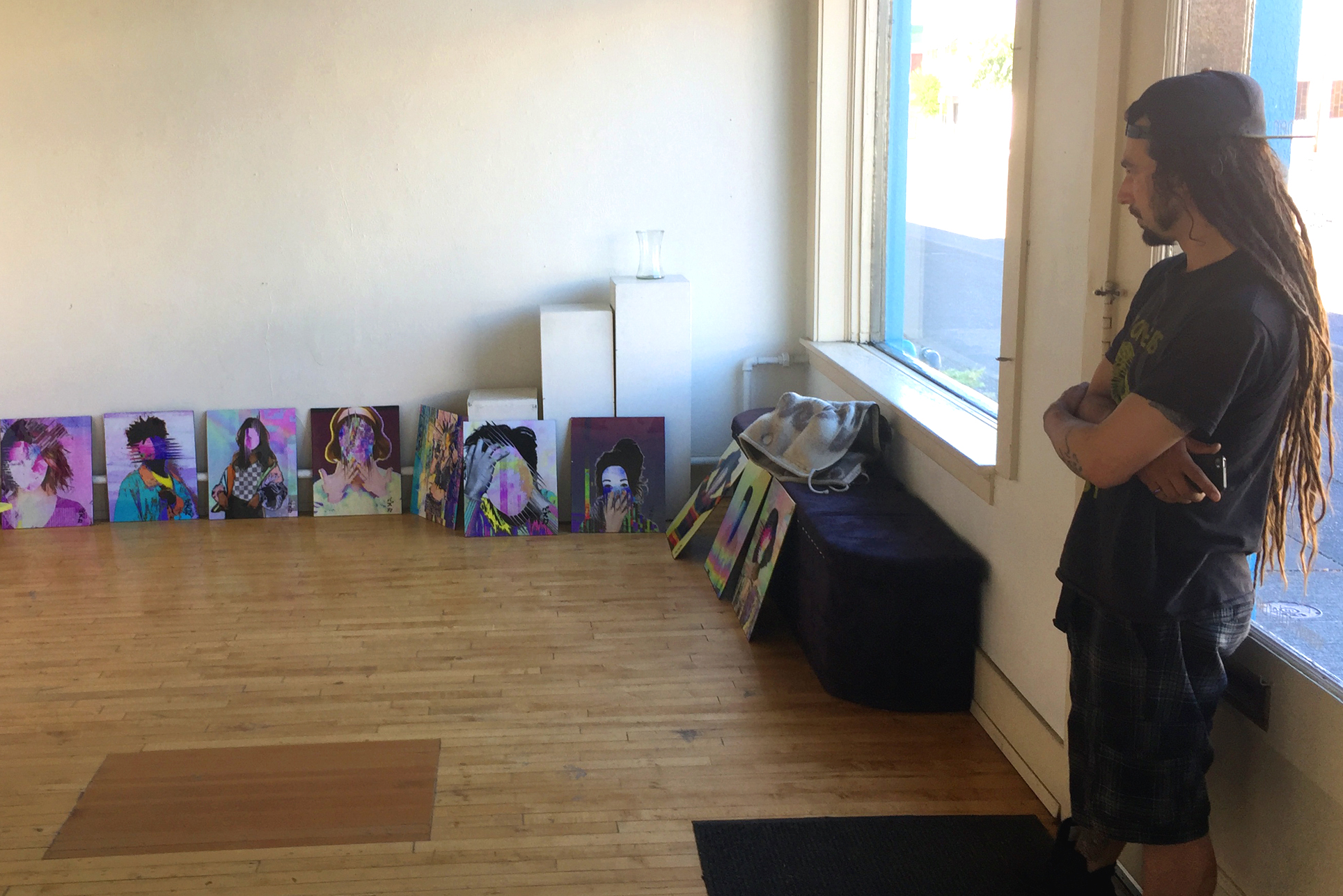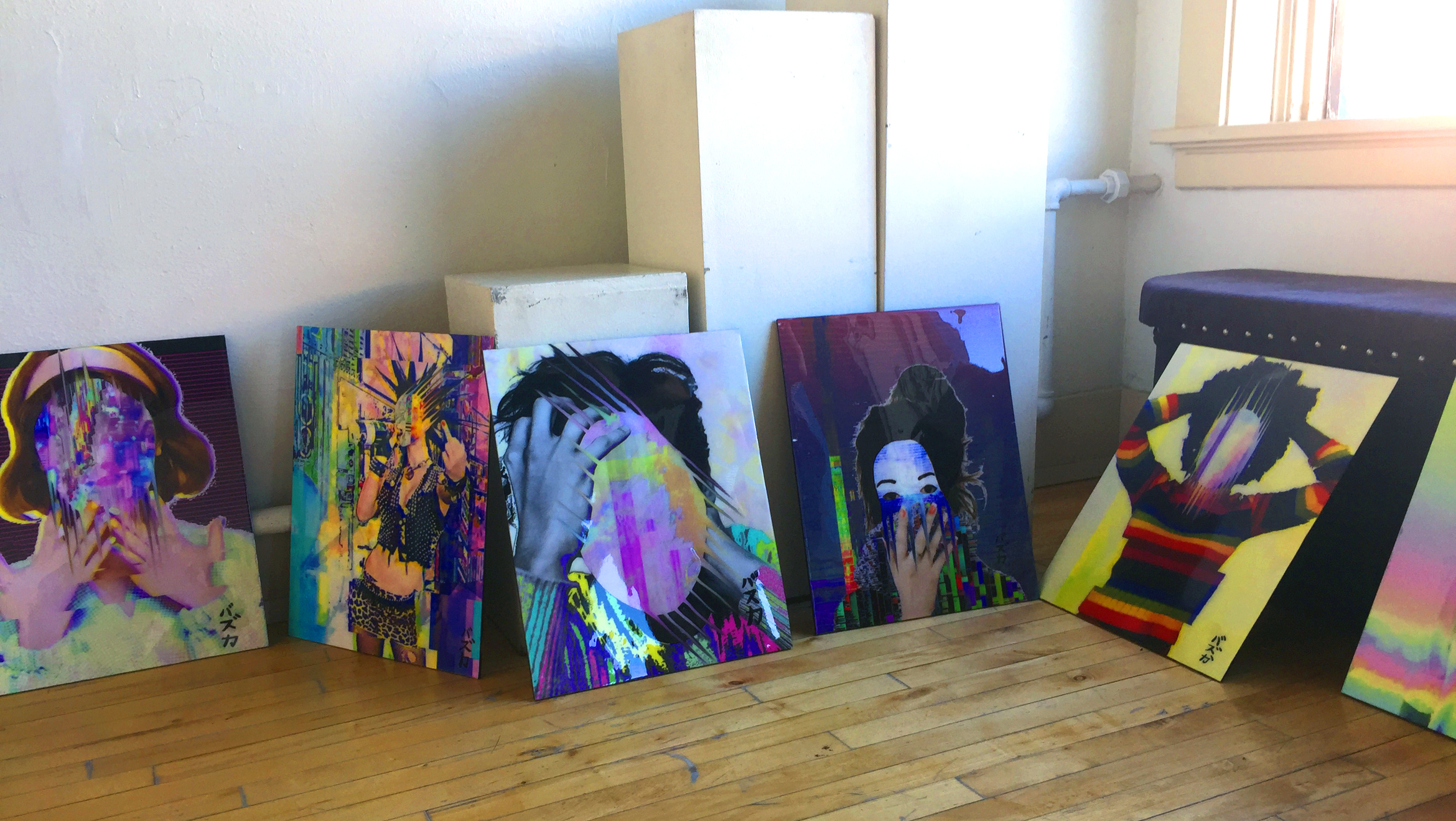 Jo Bazuka is unapologetic as an artist, creating work that strikes in the moment is contemporary, and shifts effortlessly through a variety of mediums. Music is his primary catalyst driving all other artistic endeavors. MC’ing, dance, graffiti and tattooing have all been linked through this thread of sound. The “Glitch Portraits” series of visual works arose when all other previous avenues appeared blocked. This new medium follows suit, with the musical thread influencing even the smallest facets, a digitized amalgamation of music, colour, fashion, creation and destruction. Embodying Hip-Hop and lo-fi’s sample based nature, punk rock’s “color outside the lines”, anti-authoritarian overtones, vivid bass and glitch inspired textures and effects, the cool feels of reggae, dub and the abstract improvisational sprit of jazz.