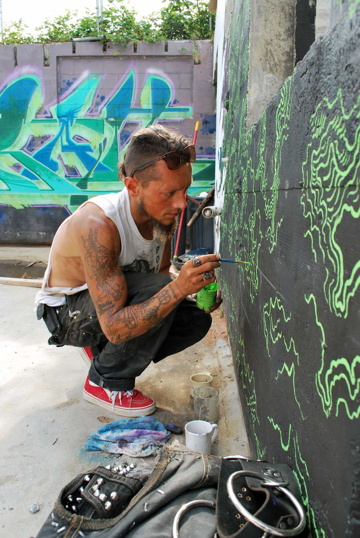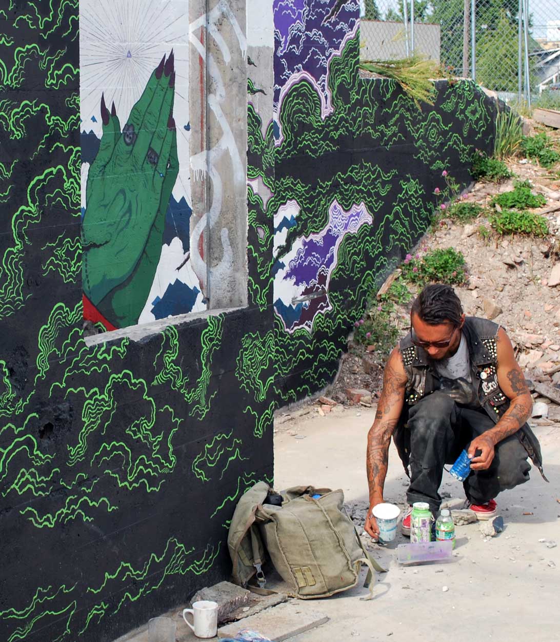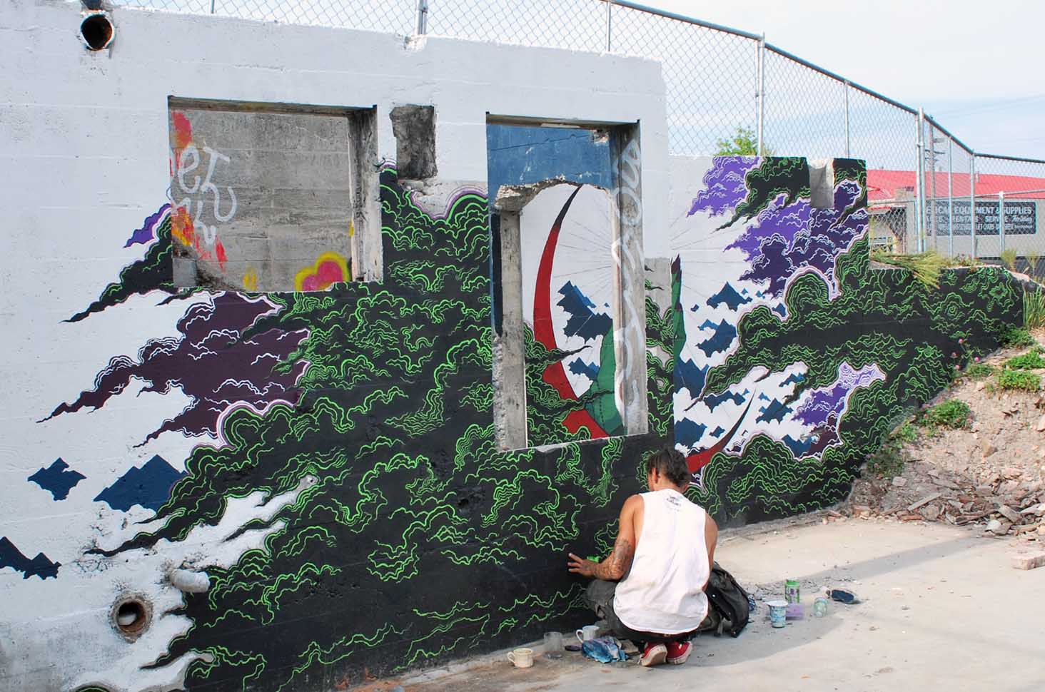 Spencer produces a range of artworks, intimate pieces small enough to fit in your pocket, and some site-specific work large enough to skateboard through. “Serenity Occult” is such a piece, an interactive mural located in the Hilltop neighborhood not far from Fulcrum Gallery. This multi level composition incorporates an old stairwell, pass-through into his composition of cloud forms, symbolic geometry, and suggestive meditations.